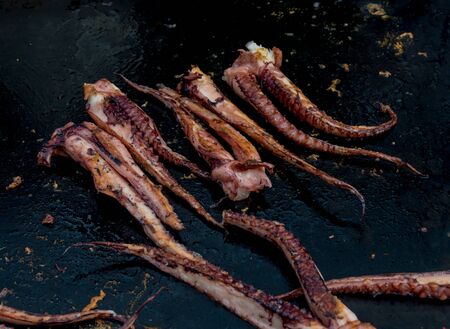Fresh grilled seafood small baby octopus tentacles during hotel brunch buffet outside outdoor in the garden by the pool. Fresh Food Buffet Brunch Catering Dining Eating Party Sharing Concept