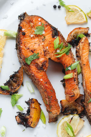 Grilled salmon steak with lemon, spices and lime in a white plate on a light table. Deliciously cooked salmon fillet