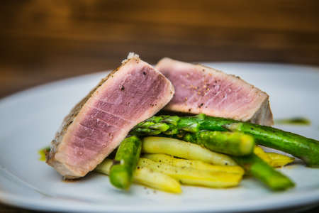 Tuna steak with asparagus and bean pods. The food in the restaurant. Food styling and restaurant meal serving.