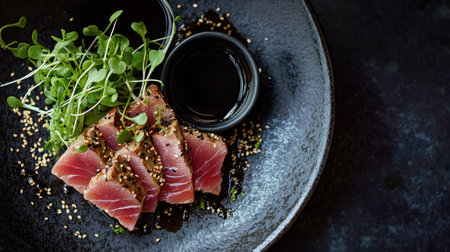 An exquisite serving of seared tuna topped with scallions and lemon, presented elegantly on a white plate with a rich soy sauce glaze. Perfect for gourmet dining.