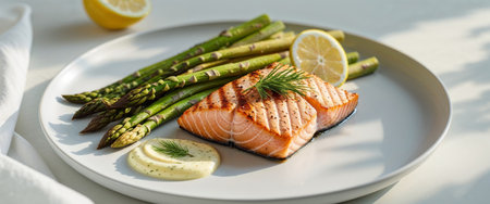 Grilled salmon fillet with asparagus and lemon on a plate