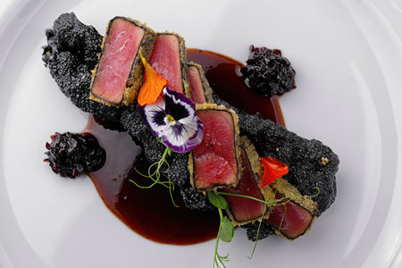AI Generated. Gourmet Tuna Steak with Balsamic Glaze and Salsa