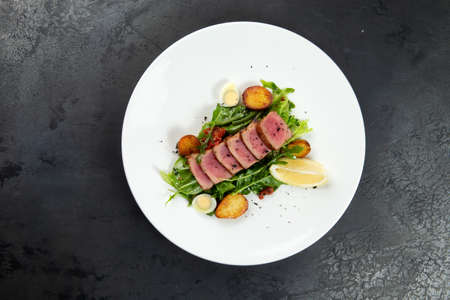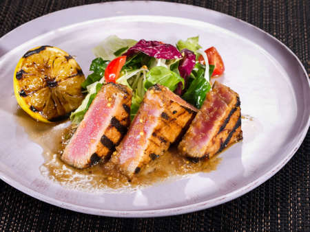 grilled tuna fillet served with salad mix and grilled lemon on a plate on dark background