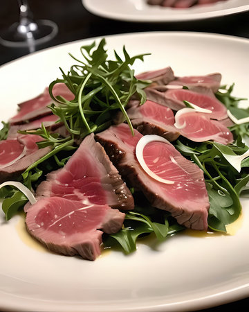An elegant carpaccio of beef tenderloin, thinly sliced and topped with arugula, shaved parmesan, and truffle oil