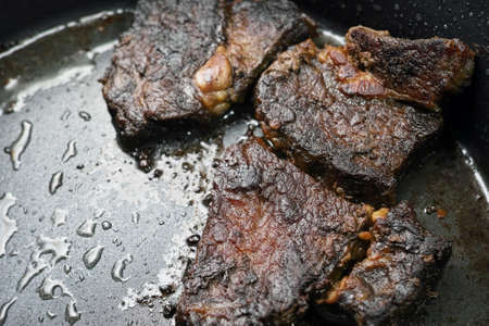 a frying pan with well-done steaks, indoor close up