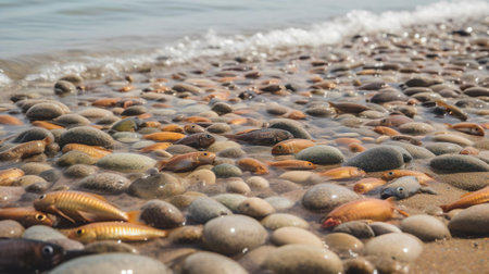 A fish rests on the sandy beach, surrounded by small stones and shells, while ocean waves quietly break in the background, highlighting the distressing issue of marine life decline.