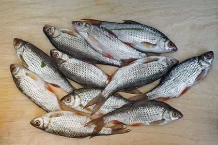 On a wooden table is fresh fish, which was caught in the river.