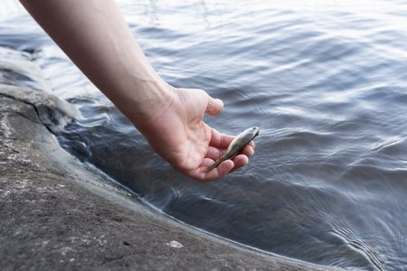 The hand of a young man releases the caught fish into the river, pond, lake