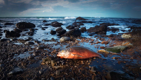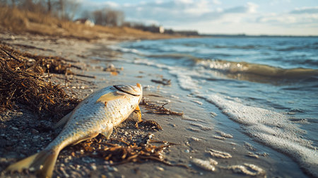 A dead fish lies on the shore, surrounded by plastic debris and oil spills, illustrating the severe impact of pollution on marine life.
