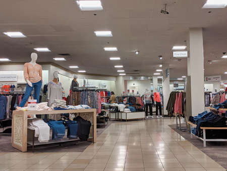 Bellevue, WA / USA - circa March 2020: Clothing on display inside a Macy's clothing and home store inside the Bellevue Mall.