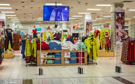 Kazan, Russia - December 22, 2019: Interior in hall of large IKEA store with a wide range of products and people in it in Russia