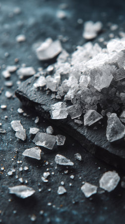 Crystalline salt granules scatter on a dark surface, revealing their textures and reflections in soft light.