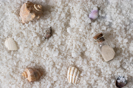 White sea bath salt on a gray background. Spa and personal care concept. background and texture.