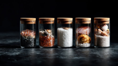 Captivating Display of Various Types of Salt and Seashells in Glass Jars with Wooden Lids on a Dark Background for Culinary or Home Decor Use