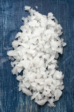 Coarse salt crystals on a blue table. sea salt. Background for advertising salty.
