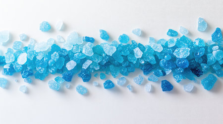 A stunning display of vibrant blue crystals and granules scattered on a clean white surface, ideal for various creative projects or backgrounds.