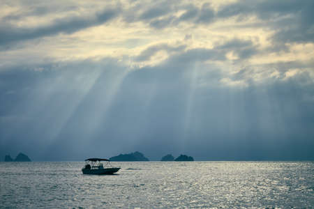 View of dawn at the seaside with the dramatic cloudscape, boat and mountain, Tioman Island