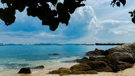 Beach rocks large Cargo ship moored in the sea side of the island.