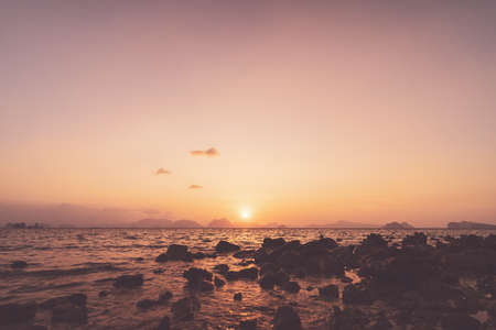 Tropical beach with smooth wave and sunset sky abstract background. Copy space of business summer vacation and travel adventure concept. Vintage tone filter effect color style.