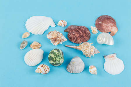 Many beautiful sea shells on blue background, flat lay. Close-up.