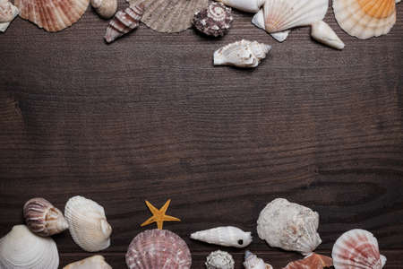 Background of wooden rude textured table with a frame of sea shells, conches and starfish