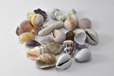 A visually appealing collection of various colorful seashells arranged on a white background, perfect for nature-inspired decor, beach themes, or marine life illustrations.