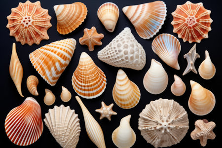 A collection of seashells arranged in a pattern on a black background, emphasizing their unique shapes and textures.