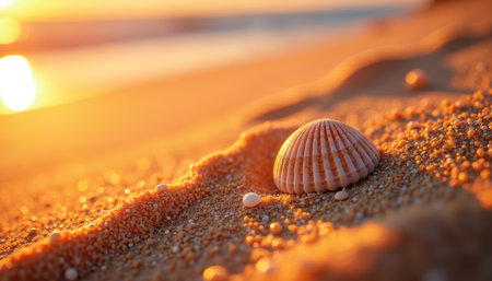 A delicate seashell nestled on warm sand as the sun sets, casting golden hues over the beach.