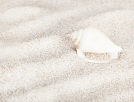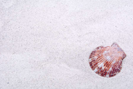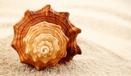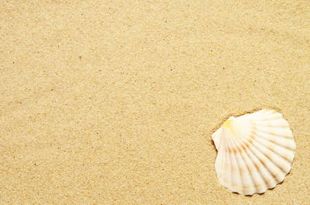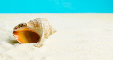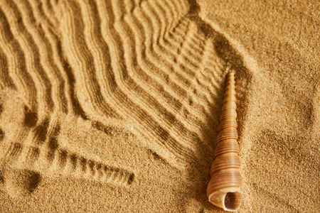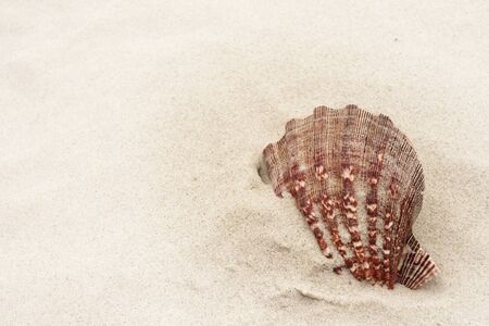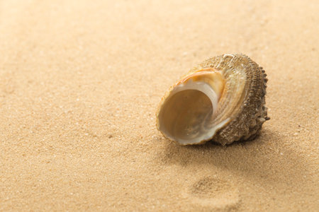 Shell on sandy background. Summer beach concept with copy space. Macro shot