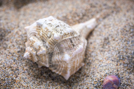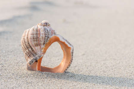 Beautiful rapana shell on the sandy beach. Summer vacation background.