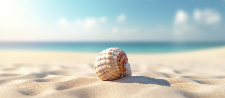 A single seashell is nestled on a soft sandy beach, surrounded by a tranquil and sunny atmosphere perfect for relaxation.