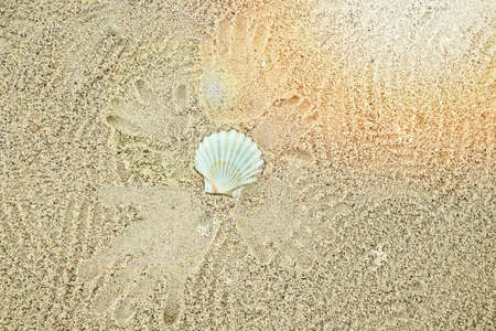 Seashells on a sandy beach. Summer background. Travel to sea countries, beach holidays