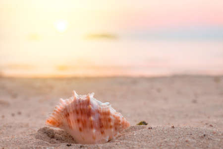 shell ashore in waves of sea in sunset. copy space for text. summer vacation concept. beautiful beach. Art Beautiful sunrise over the tropical beach. Ocean background
