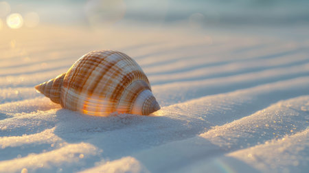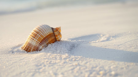 Elegant seashell resting on damp sand at the ocean edge during golden hour sunset. soft light illuminates the intricate patterns of the conch shell, reflecting on the wet beach surface. serene coastal scene symbolizing peace and summer vacation.