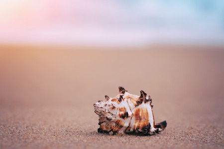 A shell close-up, lying on a sandy beach, at sunset. Selective focus, blurred background