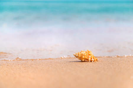 beautiful sea shell on sand with wave of on the beach over seascape in the under sunset sun light.