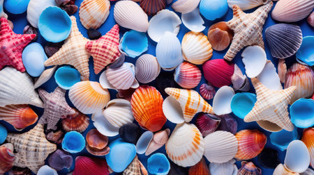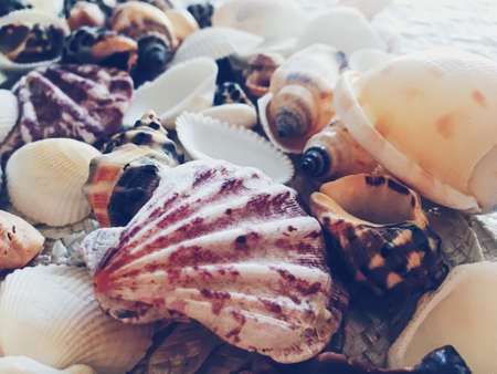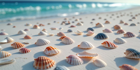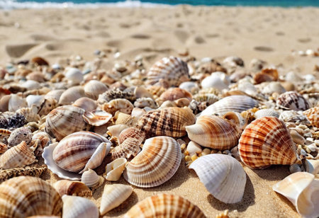 A captivating close-up of numerous seashells, showing their unique textures and colors. A tranquil summer beach scene.