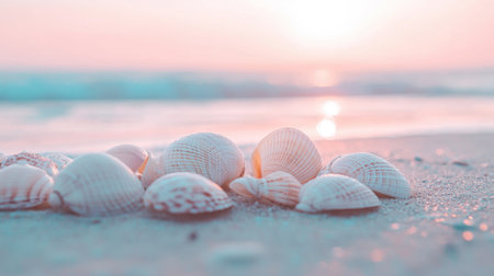 A serene scene featuring delicate seashells scattered on a sandy beach at sunrise, capturing the tranquil essence of nature's coastal beauty.