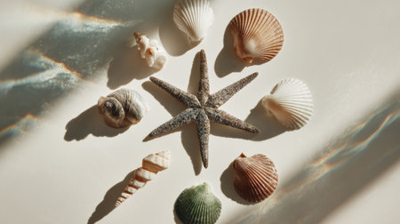 Collection of seashells and a starfish displayed on a pale beige surface, arranged in a circular pattern with visible shadows cast by natural sunlight.