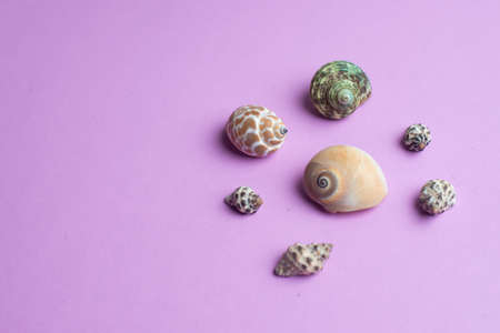 Composition of exotic sea shells on a violet background. Summer concept. Copyspace for text