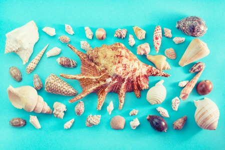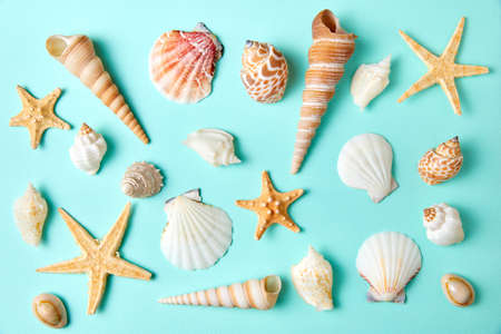 Many beautiful sea shells on blue background, flat lay. Close-up.