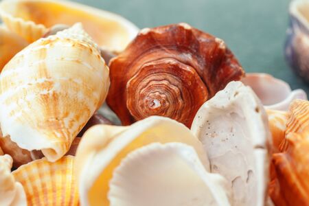 Close-up of a collection of colorful and textured sea shells, showcasing natural beauty.