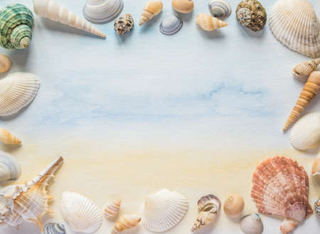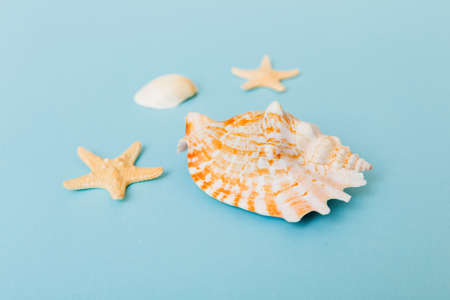 Travel, vacation concept. Sea shells on sand and blue background. Travelling