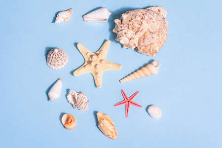 Summer vacation concept. Assorted seashells on a pastel blue background. A trendy hard light, dark shadow, flat lay, top view