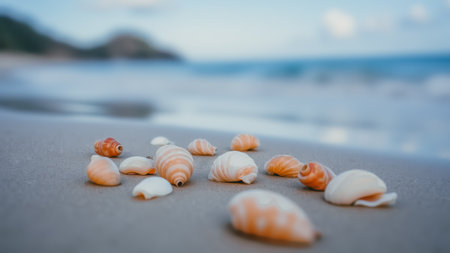 Seashells scattered on a serene beach with soft sand and gentle waves in the background, capturing the peaceful essence of a coastal environment. ideal for themes of relaxation, holidays, and natural beauty.