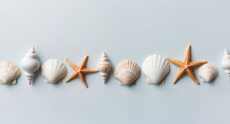 AI Generated. Seashells and Starfish Bordering a Light Blue Background