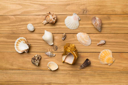 Seashells on blue wood with copy space, sea vacation background with copy space on wooden planks