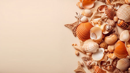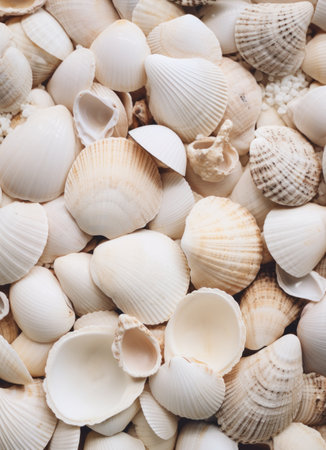 Close-up of seashells on sand forming a textured natural background, perfect for coastal, summer, and vacation-themed designs.