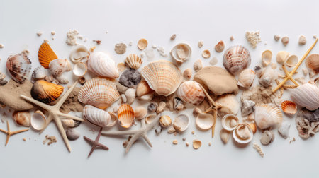 AI Generated. A collection of shells scattered on the sand near the waterline
