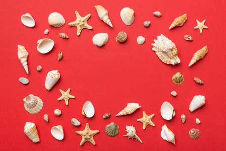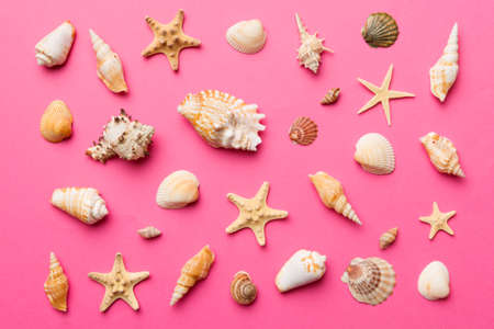 Summer time concept Flat lay composition with beautiful starfish and sea shells on colored table, top view.
